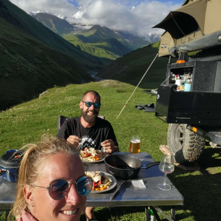 Net nadat we gegeten hadden kregen we bezoek van 2 jonge Georgiƫrs op een paard. Ze wilde graag de Defender van dichtbij zien en ze boden aan dat ik een ritje achterop mocht bij de paarden. Hilarisch in rengalop de berg op, achter het zadel zittend. We hadden instagram uitgewisseld en na een uurtje kregen we een bericht, ga nog niet naar bed! We komen met eten en drinken en laten we een feestje maken.